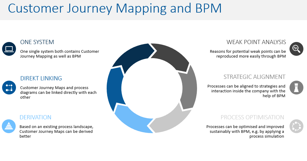 With the help of business process management, it is possible to model a customer journey as well as the systems, processes and risks required to strengthen customer focus and optimize the customer experience, rather than just internal processes. Companies that put their customers at the center must therefore also adapt their central business processes - and the customer benefit should always be the focus of the business processes.